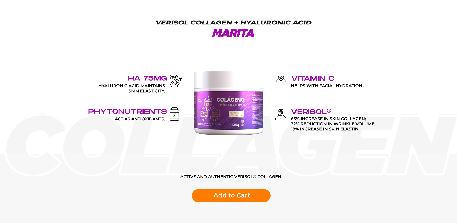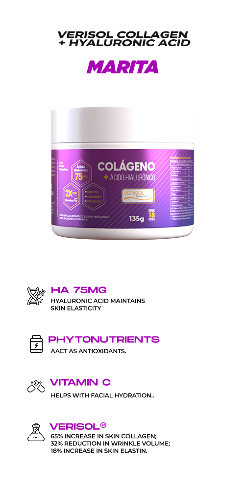 Hyaluronic Acid is known as the "hydration magnet". It retains skin moisture, keeping it firm and with a youthful appearance. Together, Verisol Collagen and Hyaluronic Acid offer a comprehensive approach to taking care of your inner and outer beauty.